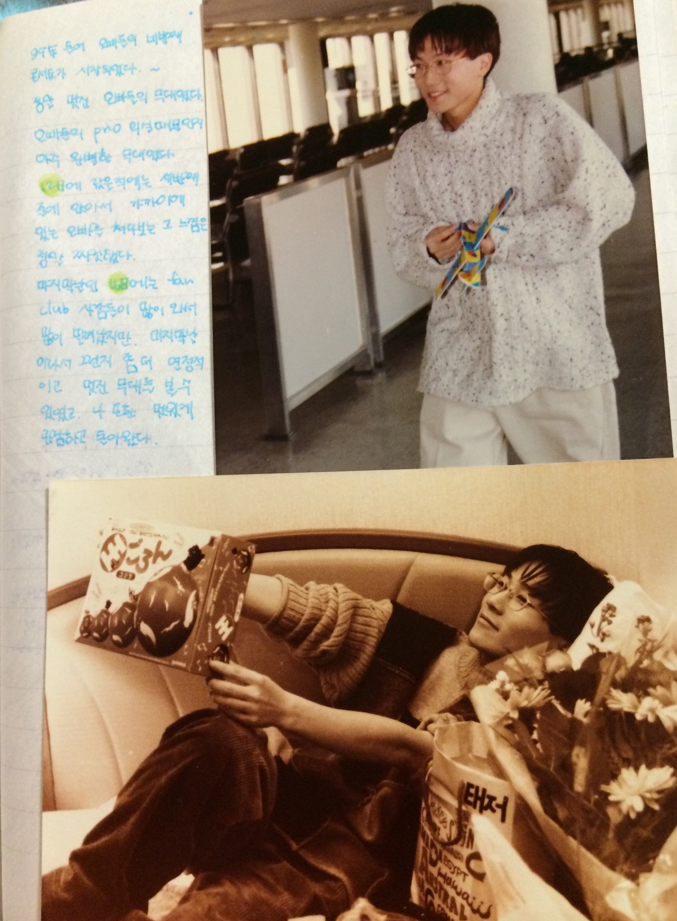 오늘은 오빠님 영상 이것저것 보며 23주년을 자축했네요~ 92년 봄 오빠님이 내 맘 속에 들어온 그 해부터 연희동 집앞, 연남동 사무실에서 마주쳤던 오빠님이 공부 열심히 하라했던 그 말 깊이 새겨 덕분에 열심히 공부도 했던.. 캠프 가서 오빠님이 우리 한 솥밥 먹었다고 했을때 너무 행복했던.. 기나긴 고3 수험생활.. 오빠님 은퇴.. 슬픔에 오빠님 이사간 빈 연희동 집 배회하고.. 다시 돌아온 오빠님 보고 너무 좋아 마냥 눈물 흘렸던.... 요때까지의 일이 오늘은 생각이 많이 나네요 9집 컴콘부터 연말콘, 앵콜콘까지 행복했던 순간들 오늘은 머릿속에 행복했던 순간들로 마무리할려고요~ 오빠님, 오늘도 오빠님의 체온이 전해졌던 하루가 지나가네요. 계속해서 제 삶의 힘이 되고, 원동력이 되어준 오빠님. 24주년 25주년... 30주년, 50주년... 계속 우리 함께해요~~ ps. 그 옛날 일기장속 제 글은 유치하여 부끄럽지만, 오빠님 예쁜 사진이 있어 투척합니다~