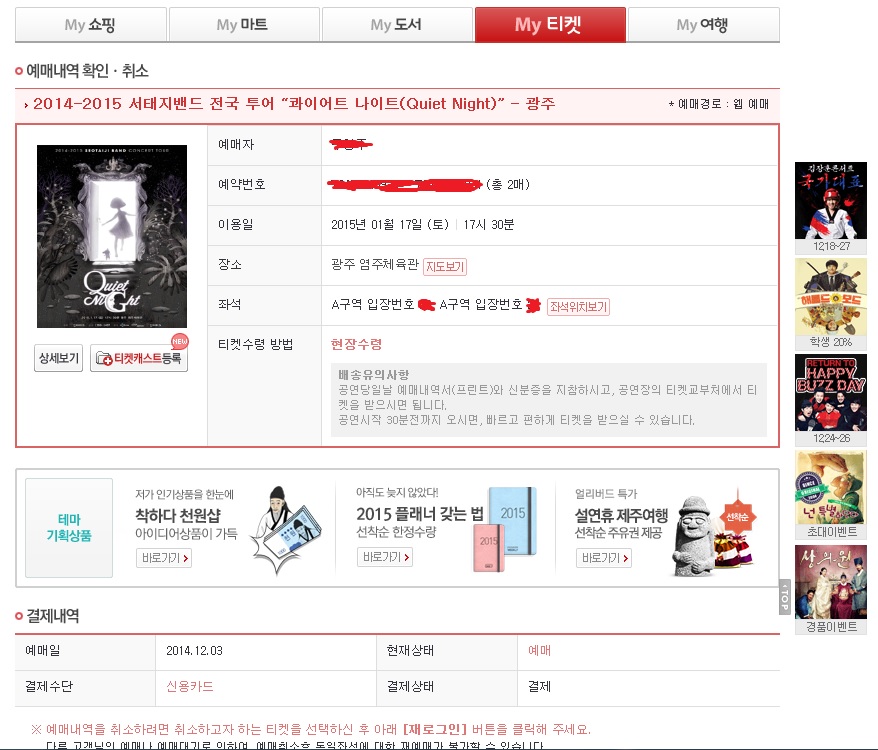 직딩이라 이제 퇴근하고 올려봅니다 페이지 정보 작성자 초록나무 회원 정보 보기 회원 정보 보기 작성일 14-12-22 21:25 본문 제발 되길~~!청소년과 같이 가서 현장수령이라 예매내역은 캡쳐했어요 댓글목록 등록된 댓글이 없습니다. TOP LIST 해당 게시물을 신고하고자 하는 사유를 선택해 주세요. 허위 혹은 고의로 신고할 경우 포인트 차감 등 불이익이 발생할 수 있습니다. 상업광고, 스팸물 음란성 게시물 상품광고, 홍보글 폭력성, 혐오글 지적재산권, 저작권 침해 명예훼손, 욕설, 비방 도배글 미풍약속, 사회질서 위반 신고하기